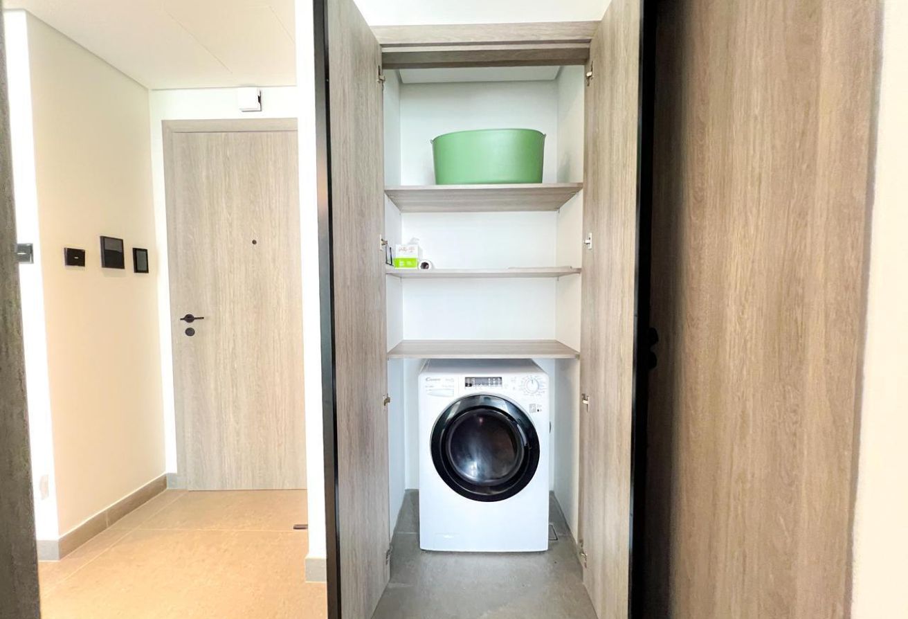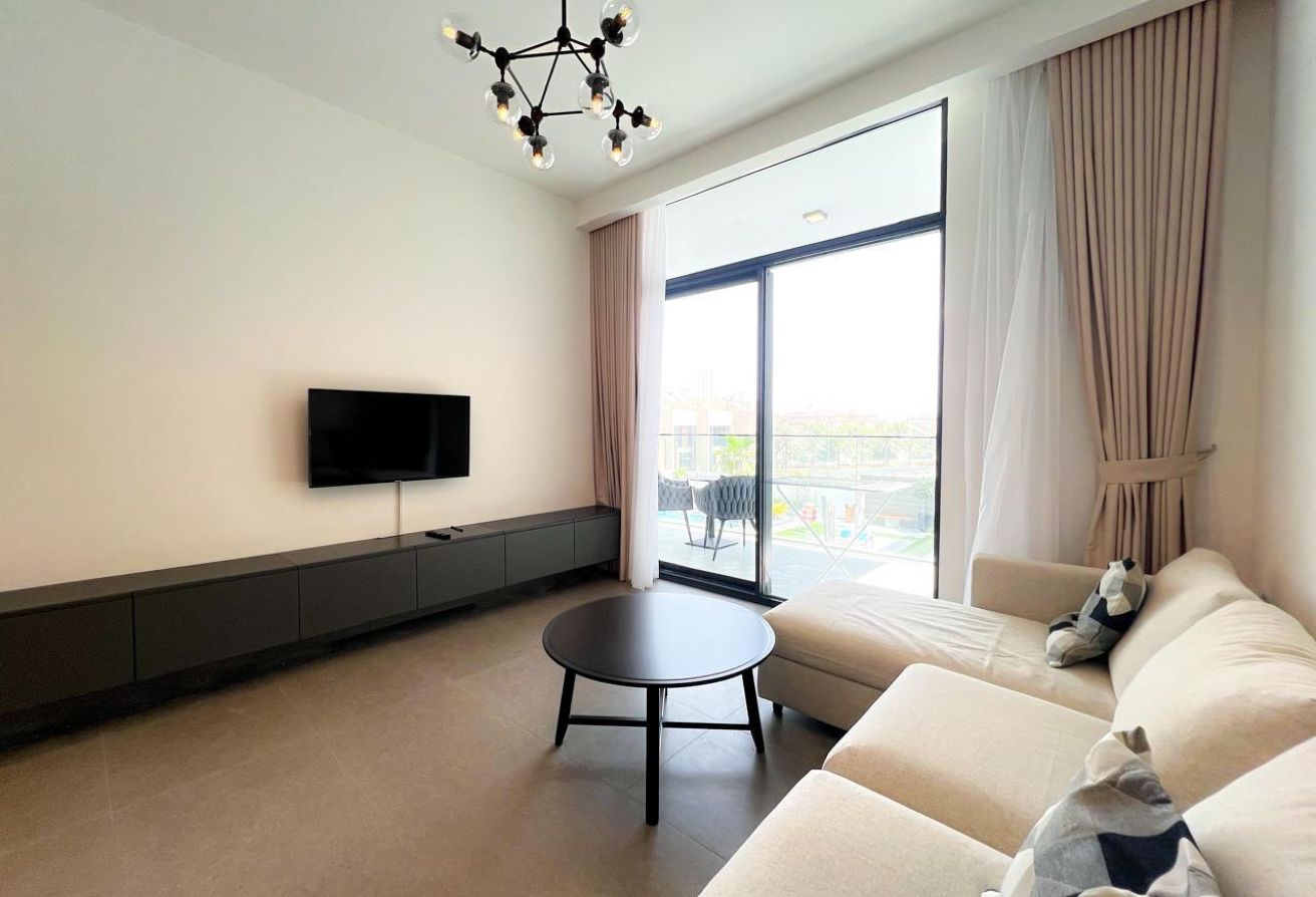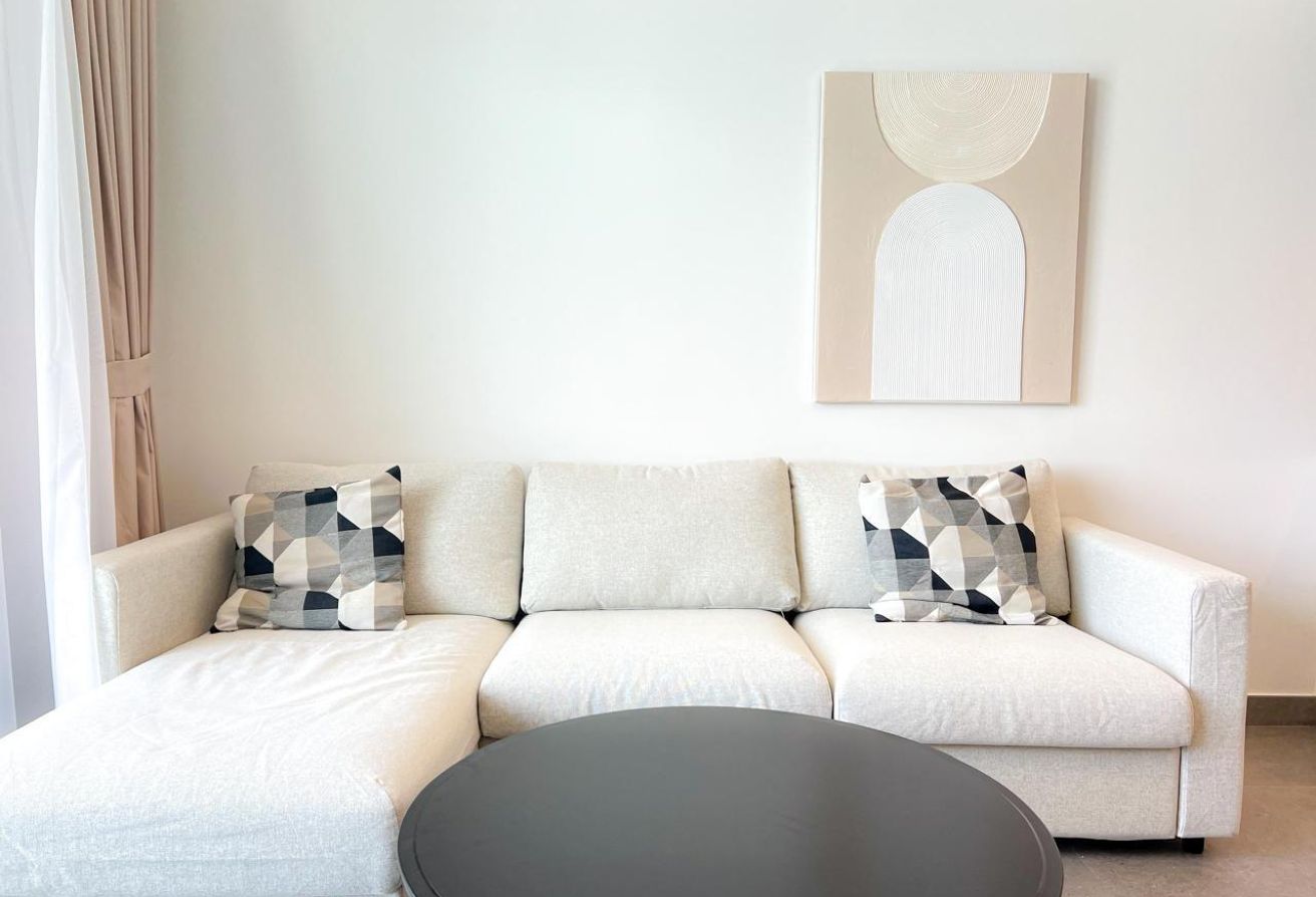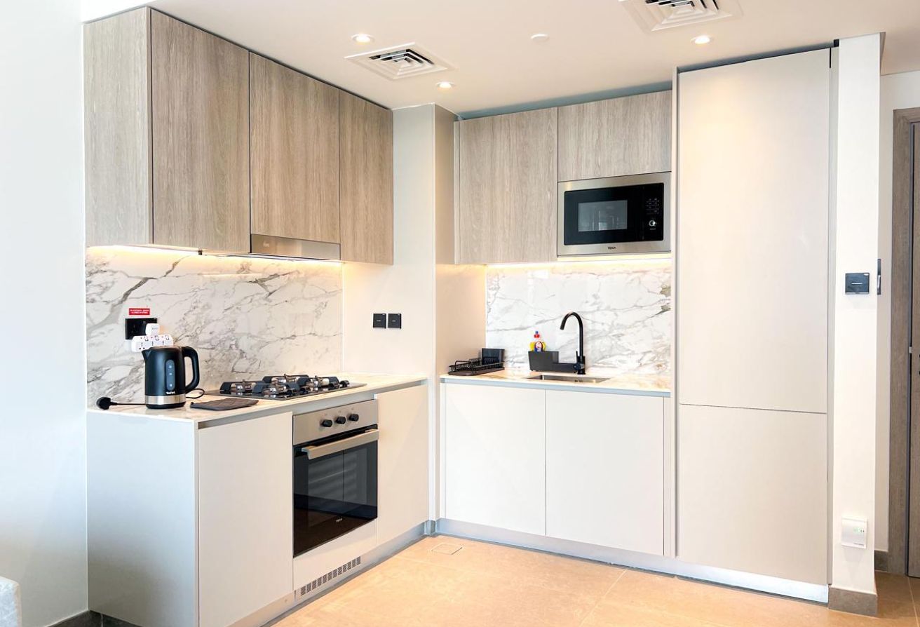 The apartment features a large living area with abundant natural light, a modern open-plan kitchen with high-end fittings, and a generously sized bedroom with built-in wardrobes. The bathroom is elegant and thoughtfully designed for everyday convenience.