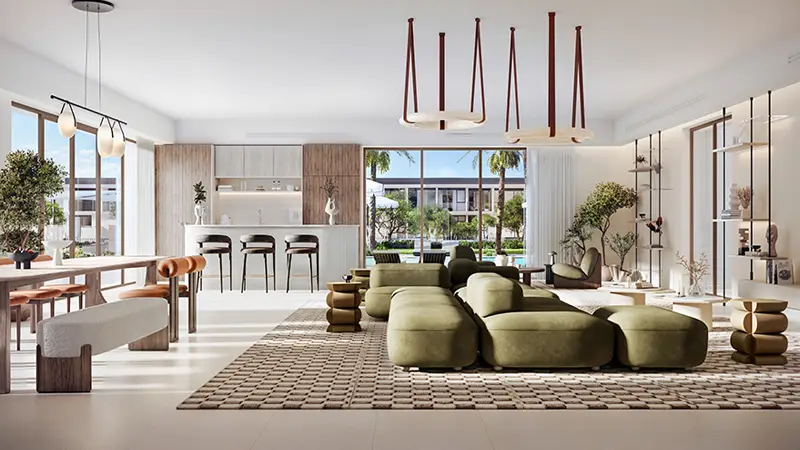 Each townhouse is designed with a focus on both functionality and style, providing a living space that caters to the needs of modern families. The sleek, contemporary facades blend seamlessly with the lush surroundings, creating a harmonious environment where luxury and nature coexist. With panoramic views through expansive windows and interiors that feature warm, earthy tones, these homes exude a sense of serenity and comfort. Residents can expect spacious living areas, modern kitchens, and well-appointed bedrooms, offering a perfect blend of sophistication and practicality.