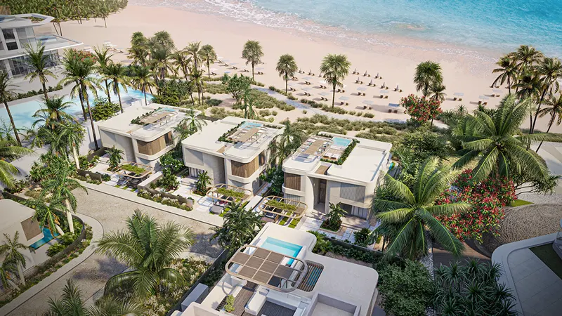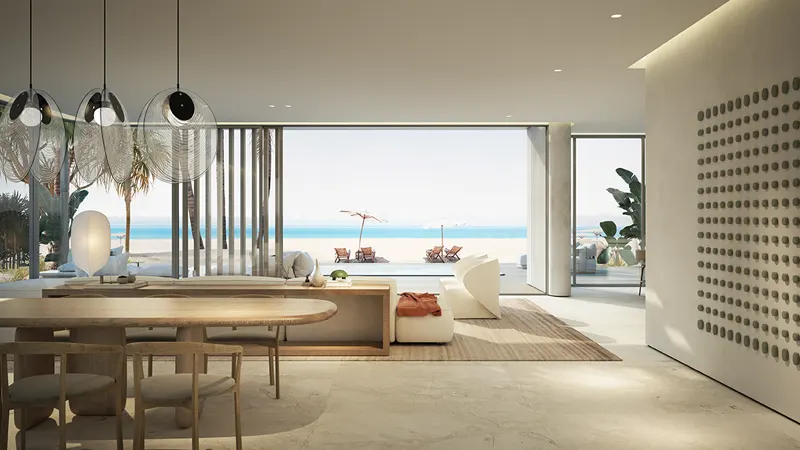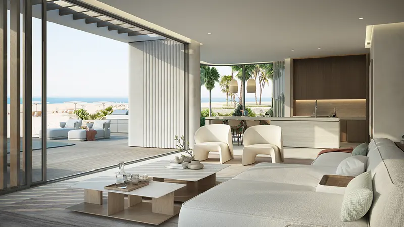 The development offers a collection of enclaves of coastal opulence, seamlessly blending modernistic living with breathtaking seascapes. These villas are designed to maximize the visual and physical connection to the beachfront, featuring open-plan living areas that exude laid-back sophistication. The ground floor enhances waterfront living with an open-plan living, dining, and show kitchen seamlessly connected to the outdoor pool deck.