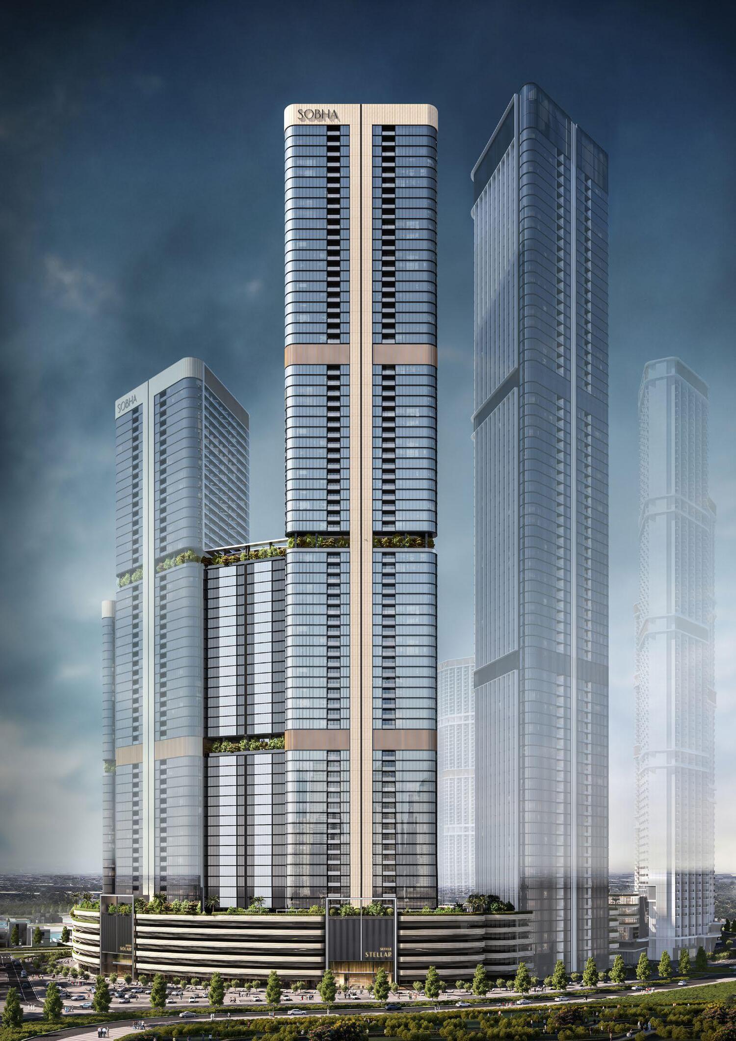Skyvue Stellar is a pinnacle of luxury living, set within the prestigious Sobha Hartland II community in Dubai. As the tallest tower in the Skyvue collection, it offers breathtaking panoramic views of Downtown Dubai and the serene Ras Al Khor Wildlife Sanctuary. Designed with sophistication, each residence features floor-to-ceiling windows that invite natural light and provide an immersive living experience. The tower’s striking architecture, with its zig-zag facade and triangular floor plan, enhances the aesthetic appeal while ensuring an open, airy atmosphere.